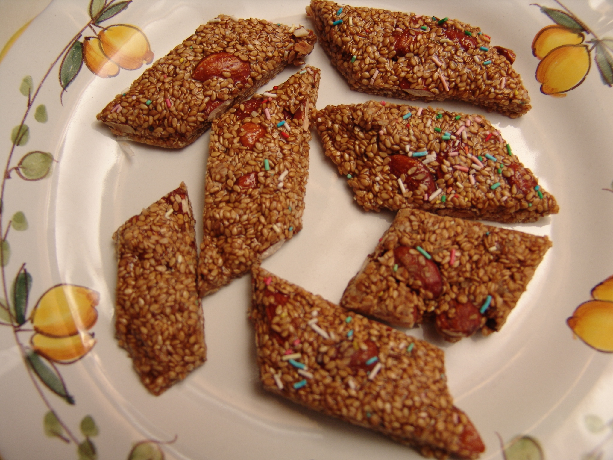 Per Natale questo saluto, già di per se molto impegnativo, doveva essere accompagnato da una leggera genuflessione e dal bacia mano. “Ma questa poi è inconcepibile non ce la faccio” dicevo a mio padre che mi rispondeva “na paura sono vecchietti”, Come dire tanto ne avranno ancora per poco facciamoli contenti. Quella baciata di mano a mio nonno Turi gli illuminava gli occhi e i baffi si irrigidivano a fil di ferro, facendo spuntare un sorriso solare, a voler dire “anche quest’anno ce l’ho fatta”. Superata la crisi generazionale si scendevano altre scale e si arrivava in cucina con al centro una grande conca con il carbone accesso e profumo di bucce di mandarino bruciato. Mia nonna serviva mandarini, qualche arancio, noci e nocciole, biscotti e giuggiulena (in foto), torrone. Ma sopratutto indimenticabili profumate bucce di arance candite.