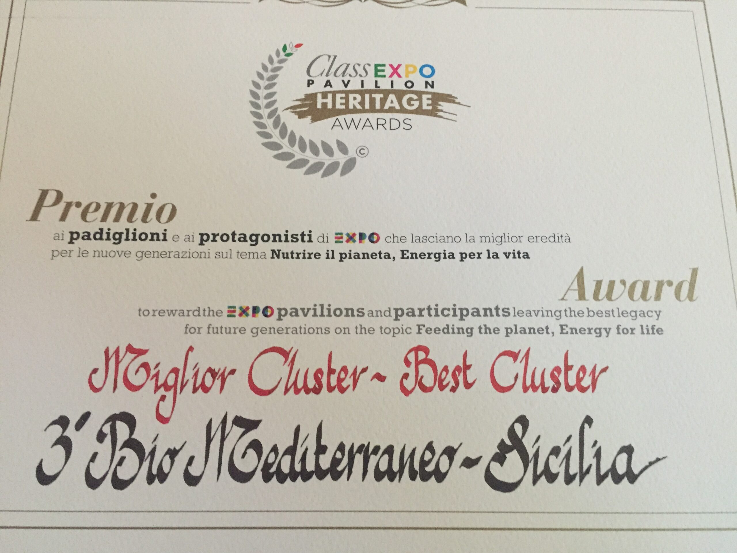 Milano 31 ottobre – Il Cluster BioMediterraneo ha ricevuto il premio Class Expo Pavilion Heritage Awards, destinato ai padiglioni e protagonisti di Expo, che hanno saputo meglio interpretare e comunicare il tema dell’Esposizione Universale, lasciando così la migliore eredità per le nuove generazioni, in termini di impatto, interesse, cambiamenti delle abitudini di consumo e rispetto per quanto il pianeta produce, sul tema Nutrire il Pianeta Energia per la Vita.